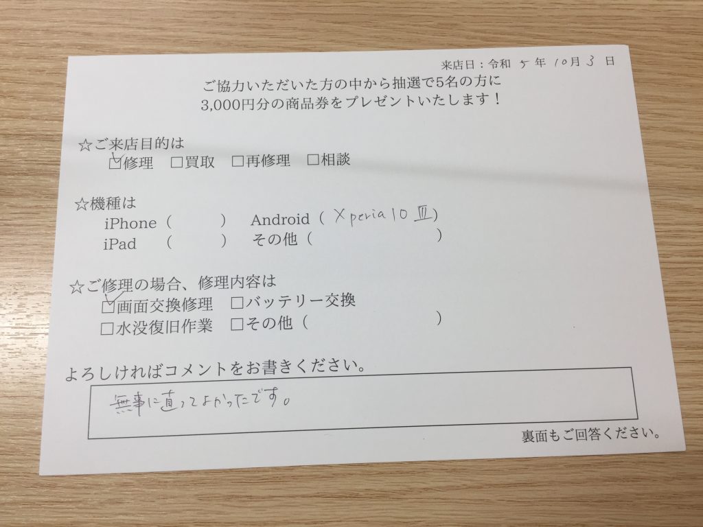 スマホスピタル 大阪梅田 【お客様の声】Xperia10Ⅲ画面交換集をさせて頂きました。