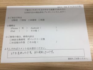 スマホスピタル 大阪梅田 【お客様の声】iPhoneⅩバッテリー交換修理をさせて頂きました。