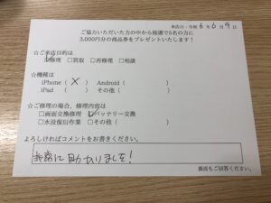 スマホスピタル 大阪梅田 【お客様の声】大阪市からお越しのお客様iPhoneXバッテリー交換修理をさせて頂きました。