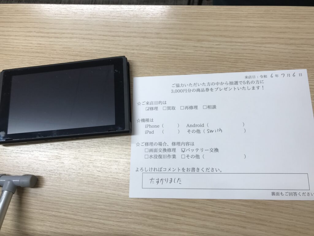 スマホスピタル 大阪梅田 【お客様の声】大阪市からお越しのお客様Switchバッテリー交換させて頂きました。