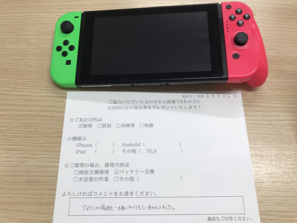 スマホスピタル 大阪梅田 【お客様の声】大阪市からお越しのお客様Switchバッテリー交換修理させて頂きました。