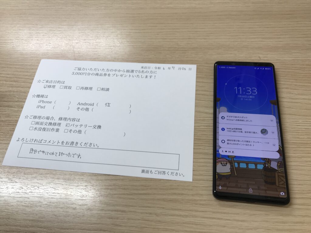 スマホスピタル 大阪梅田 【お客様の声】大阪市からお越しのお客様Xperia1Ⅱバッテリー交換修理させて頂きました。