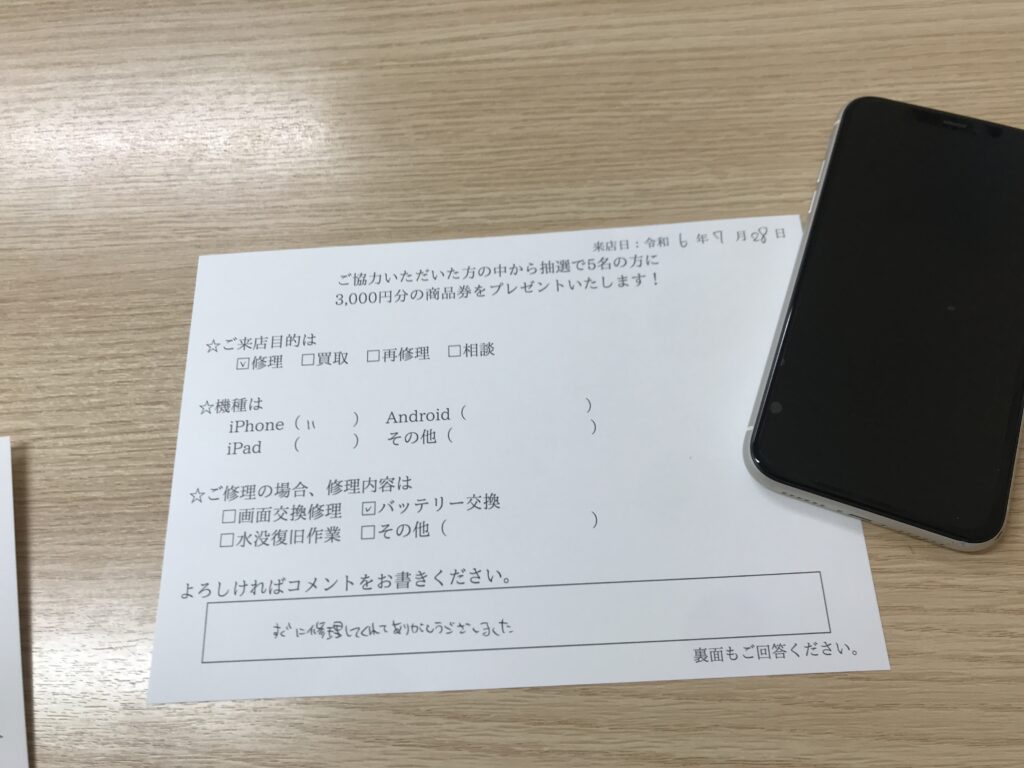 スマホスピタル 大阪梅田 【お客様の声】大阪市からお越しのお客様iPhone11バッテリー交換修理させて頂きました。