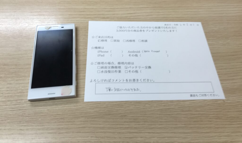 スマホスピタル 大阪梅田 【お客様の声】大阪市からお越しのお客様XperiaXcompactバッテリー交換修理をさせて頂きました。