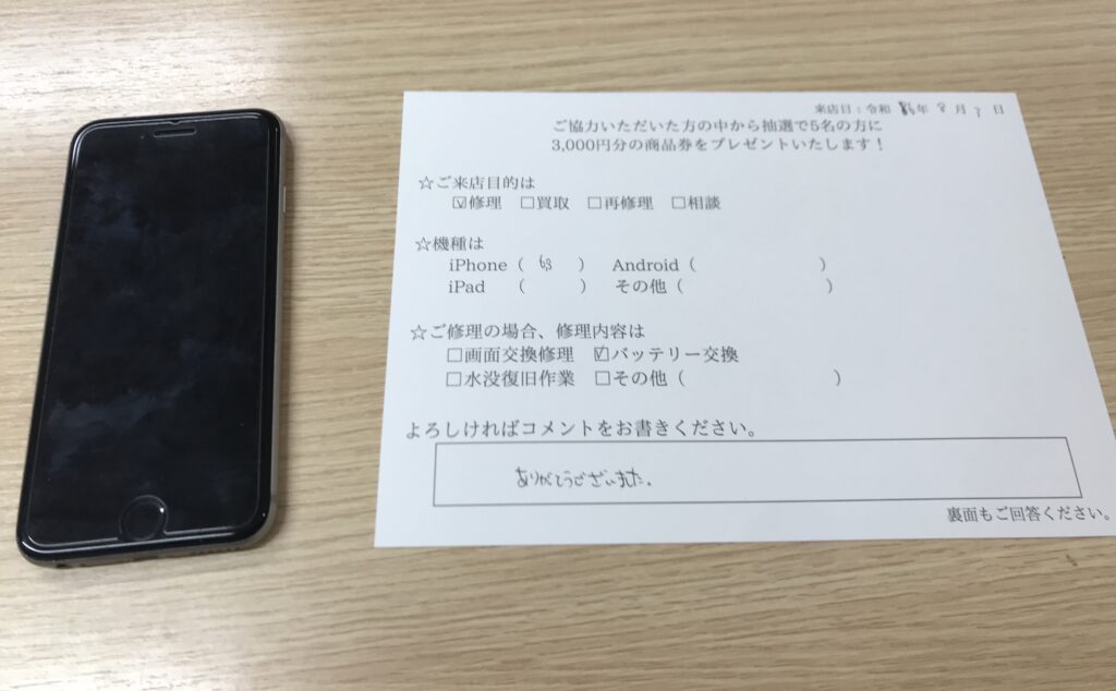 スマホスピタル 大阪梅田 【お客様の声】大阪市からお越しのお客様iPhone6sバッテリー交換修理をさせて頂きました。