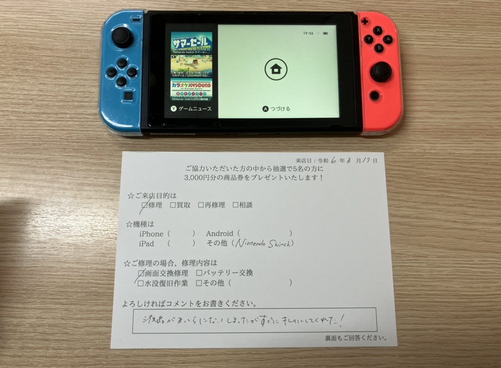スマホスピタル 大阪梅田 【お客様の声】尼崎市よりお越しのお客様のNintendo Switchの液晶交換をしました!