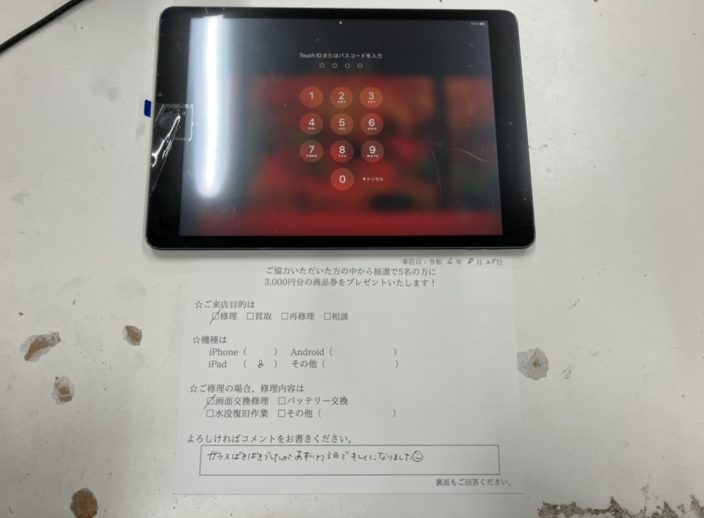 スマホスピタル 大阪梅田 【お客様の声】大阪市北区よりお越しのお客様のiPad(第8世代)のガラス交換修理をしました!