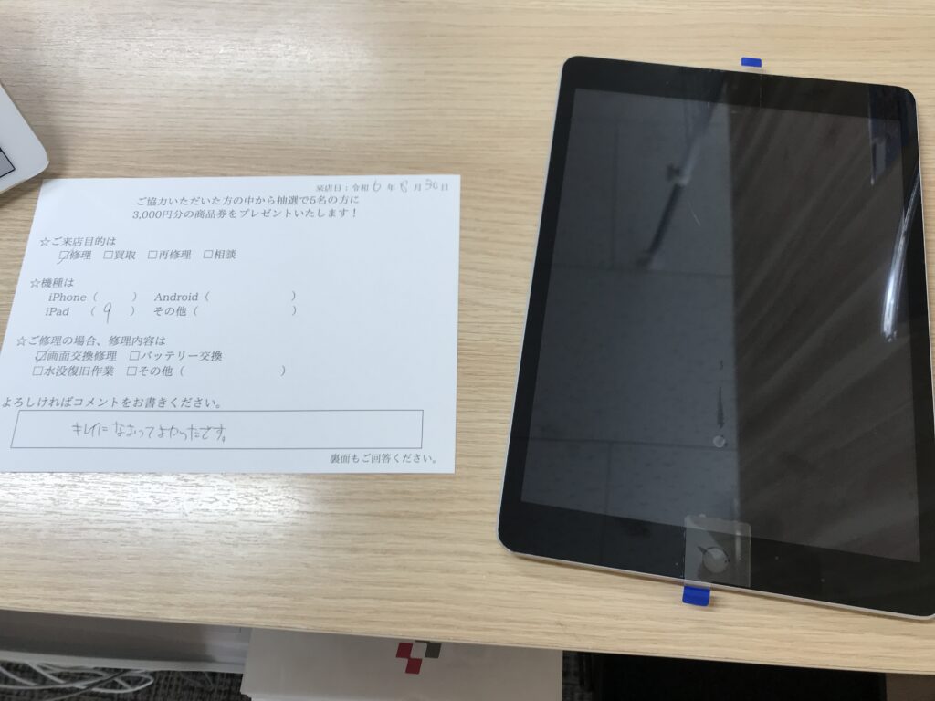 スマホスピタル 大阪梅田 【お客様の声】大阪市よりお越しのお客様iPad9ガラス交換修理をさせて頂きました。