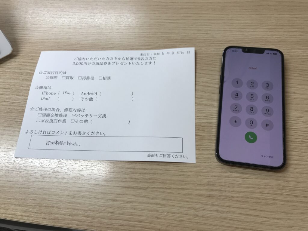スマホスピタル 大阪梅田 【お客様の声】大阪市よりお越しのお客様iPhone13Proバッテリー交換修理させて頂きました。