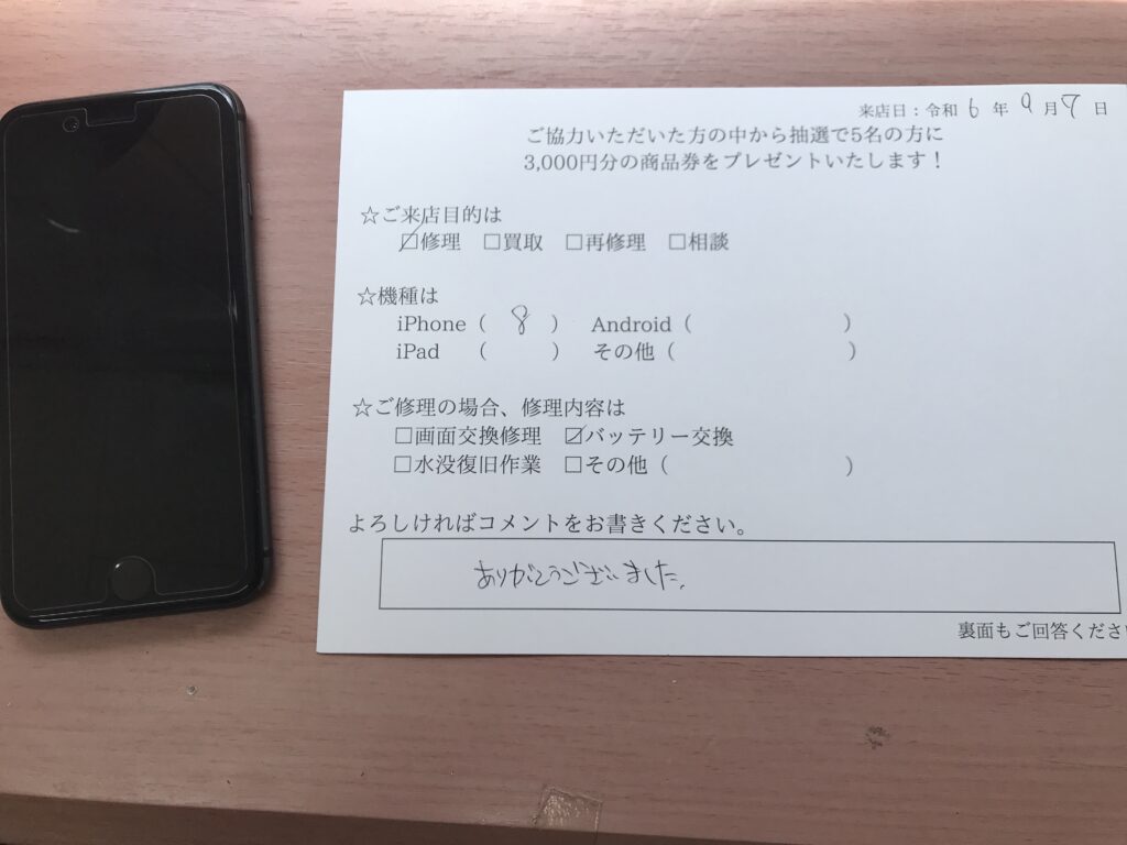 スマホスピタル 大阪梅田 【お客様の声】大阪市よりお越しのお客様iPhone8バッテリー交換修理をさせて頂きました。