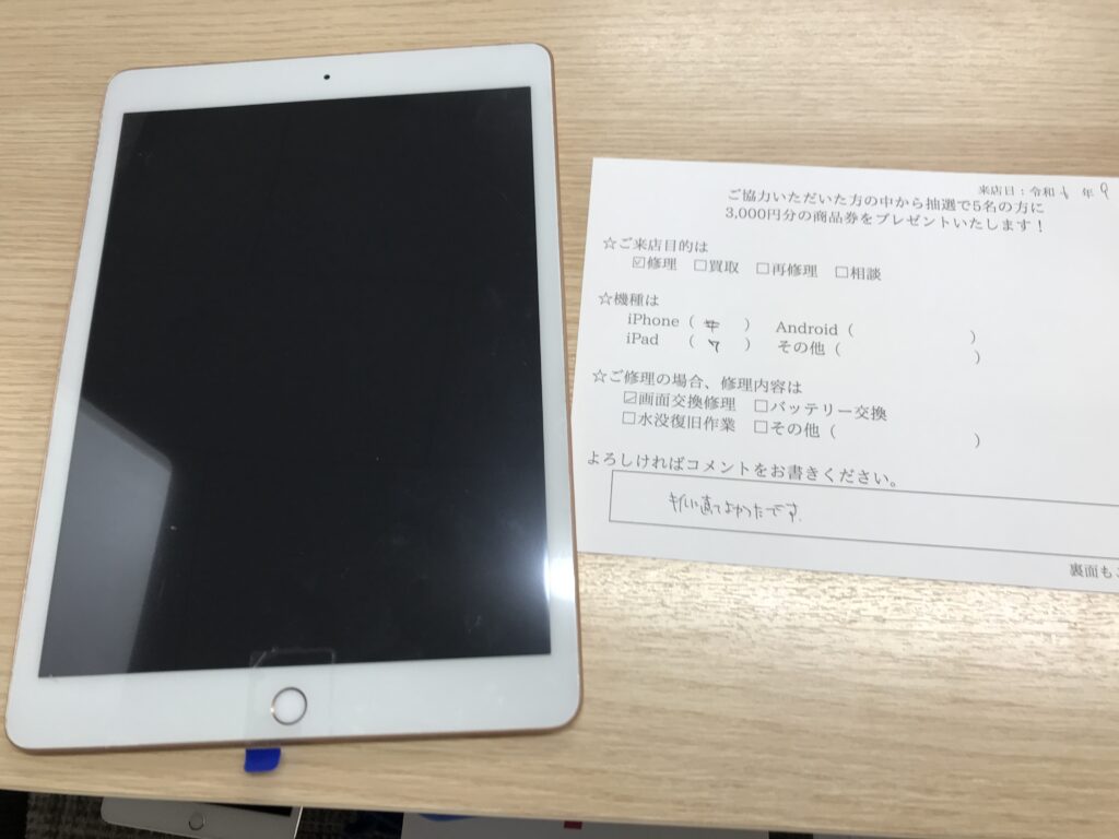 スマホスピタル 大阪梅田 【お客様の声】大阪市よりお越しのお客様iPad7ガラス交換修理をさせて頂きました。