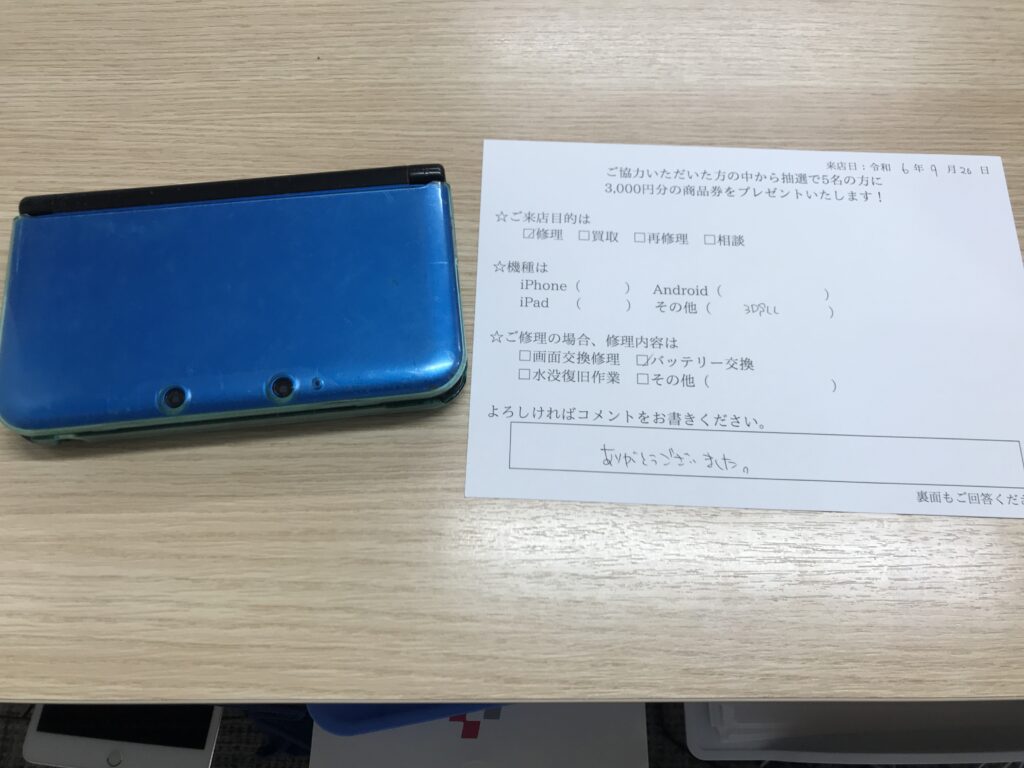 スマホスピタル 大阪梅田 【お客様の声】大阪市よりお越しのお客様3DSLLバッテリー交換修理させて頂きました。