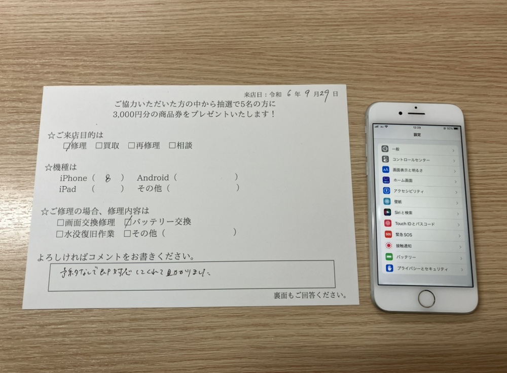 スマホスピタル 大阪梅田 【お客様の声】大阪市よりお越しのお客様のiPhone8のバッテリー交換修理をしました!