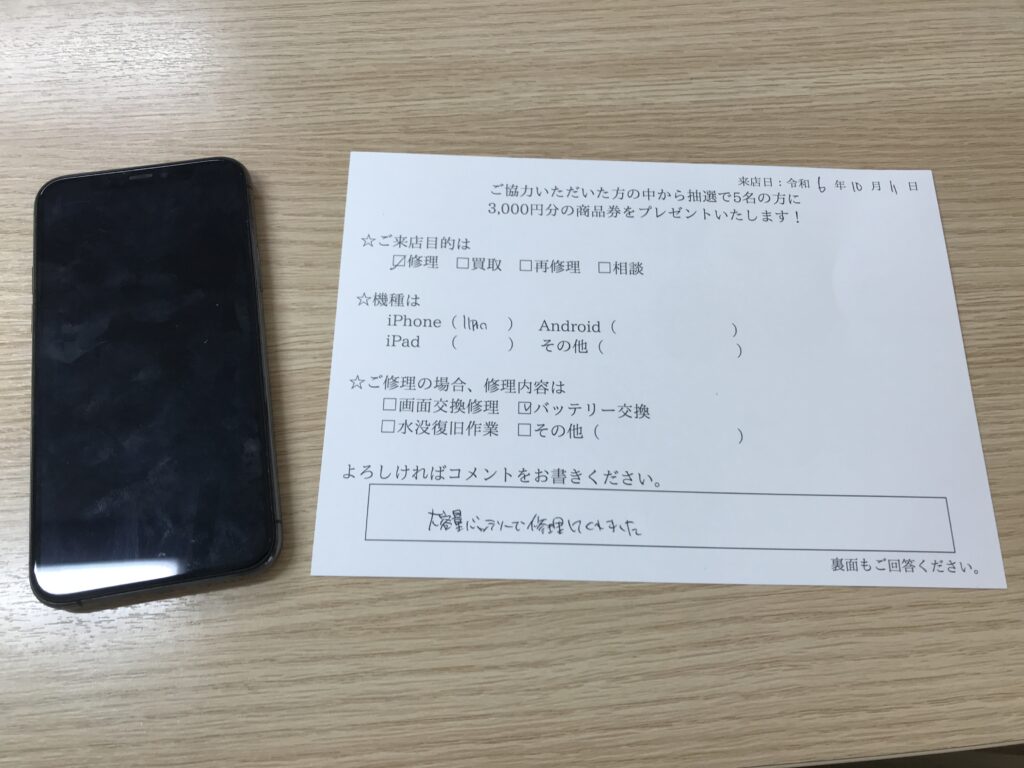 スマホスピタル 大阪梅田 【お客様の声】大阪市からお越しのお客様iPhone11Pro大容量バッテリーの交換修理させて頂きました。