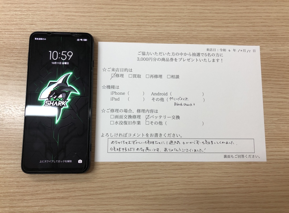 スマホスピタル 大阪梅田 【お客様の声】尼崎市よりお越しのお客様のXiaomi Black Shark 3のバッテリー交換修理をしました!