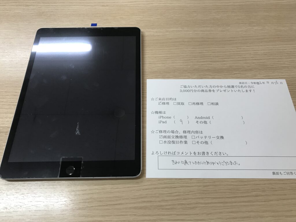 スマホスピタル 大阪梅田 【お客様の声】大阪市よりお越しのお客様iPad9ガラス交換修理をさせて頂きました。