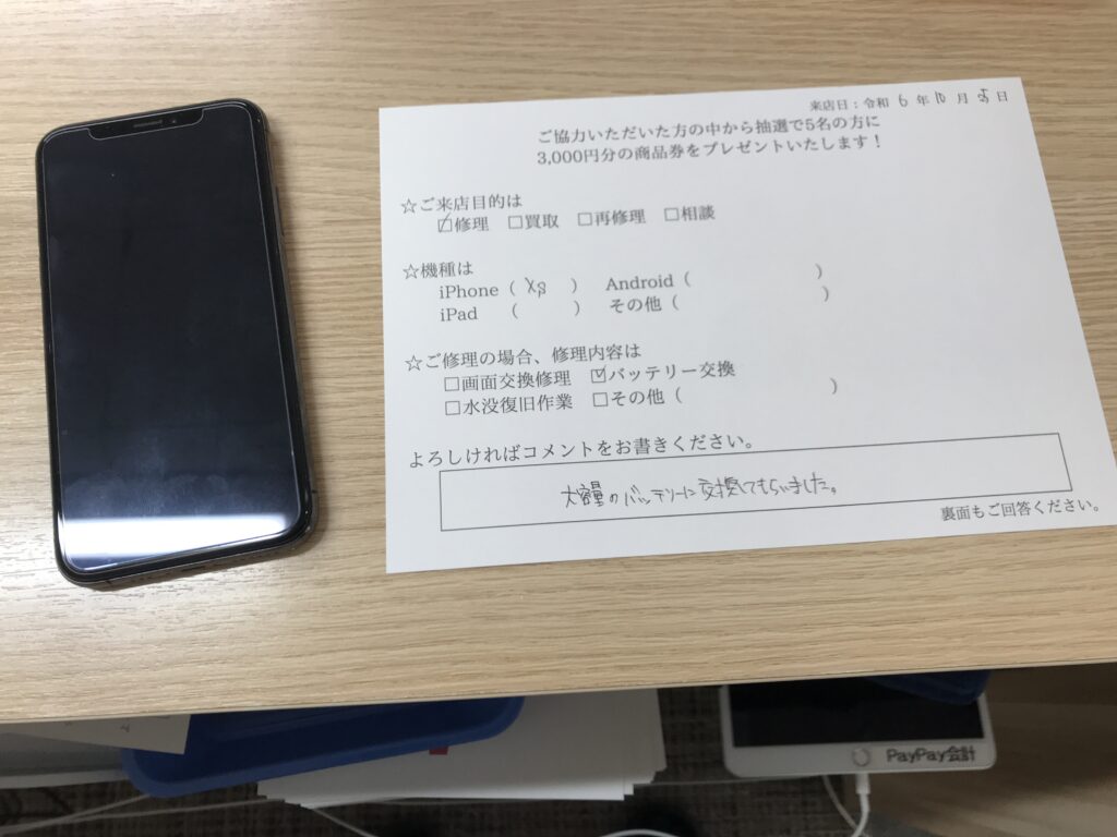 スマホスピタル 大阪梅田 【お客様の声】大阪市よりお越しのお客様iPhoneXsバッテリー交換修理させて頂きました。