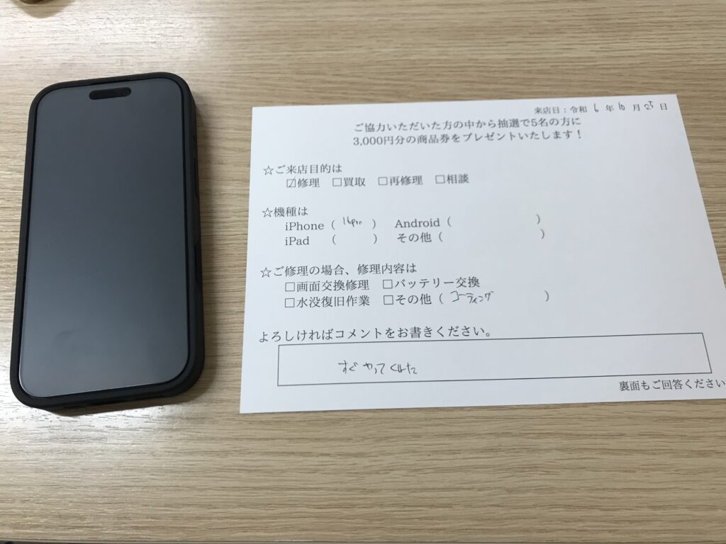 スマホスピタル 大阪梅田 【お客様の声】大阪市よりお越しのお客様iPhone16Proガラスコーティングさせて頂きました。