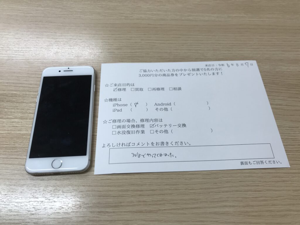 スマホスピタル 大阪梅田 【お客様の声】大阪市よりお越しのお客様のiPhone8のバッテリー交換をしました。