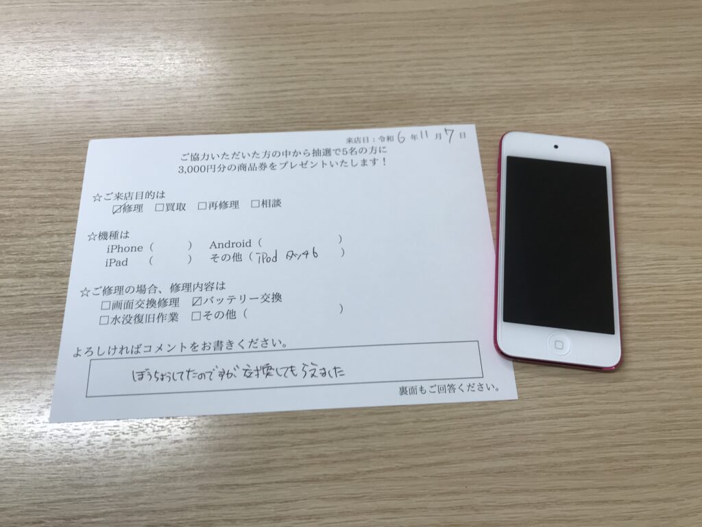 スマホスピタル 大阪梅田 【お客様の声】兵庫県よりお越しのお客様のiPod touch(第6世代)のバッテリー交換をしました。