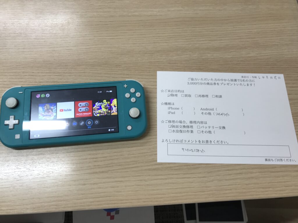 スマホスピタル 大阪梅田 【お客様の声】豊中市よりお越しのお客様Switchlite液晶画面交換修理させて頂きました。