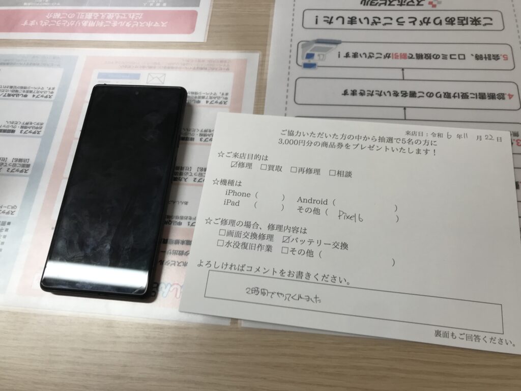 スマホスピタル 大阪梅田 【お客様の声】吹田市よりお越しのお客様Pixel6バッテリー交換修理をさせて頂きました。
