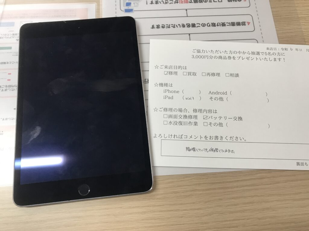 スマホスピタル 大阪梅田 【お客様の声】豊中市よりお越しのお客様iPadmini3バッテリー交換修理させて頂きました。