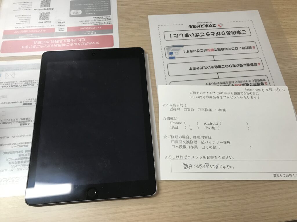 スマホスピタル 大阪梅田 【お客様の声】大阪市よりお越しのお客様iPad6バッテリー交換修理をさせて頂きました。
