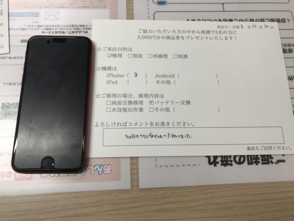 スマホスピタル 大阪梅田 【お客様の声】東大阪市よりお越しのお客様iPhone8バッテリー交換修理させて頂きました。