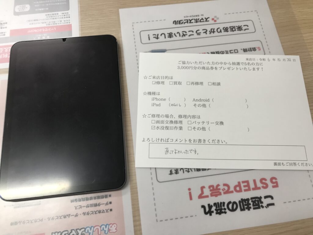 スマホスピタル 大阪梅田 【お客様の声】大阪市よりお越しのお客様iPadmini6水没復旧作業をさせて頂きました。