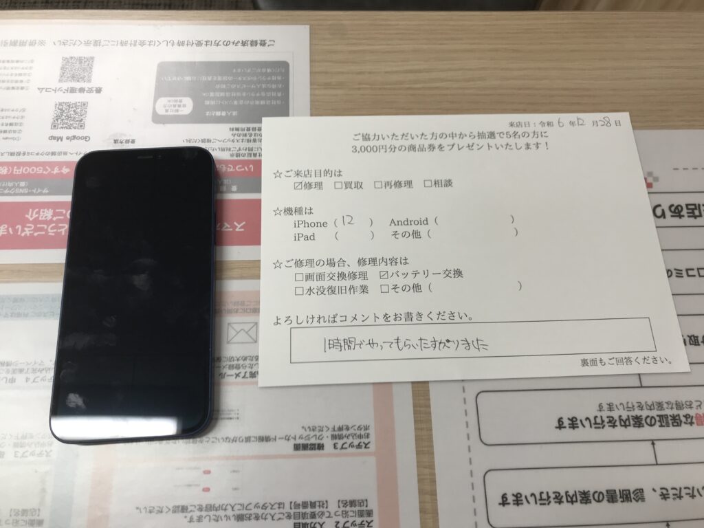 スマホスピタル 大阪梅田 【お客様の声】東大阪市よりお越しのお客様iPhone12バッテリー交換修理をさせて頂きました。