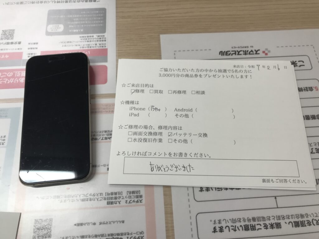 スマホスピタル 大阪梅田 【お客様の声】大阪市よりお越しのお客様iPhone15Proバッテリー交換修理をさせて頂きました。