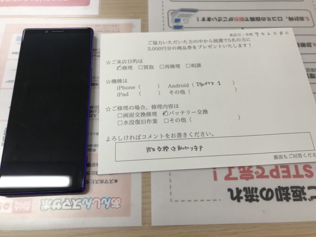 スマホスピタル 大阪梅田 【お客様の声】大阪市よりお越しのお客様Xperia1バッテリー交換修理をさせて頂きました。
