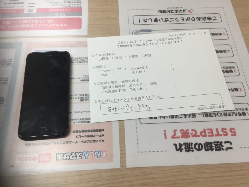 スマホスピタル 大阪梅田 【お客様の声】豊中市よりお越しのお客様iPhone7バッテリー交換修理させて頂きました。