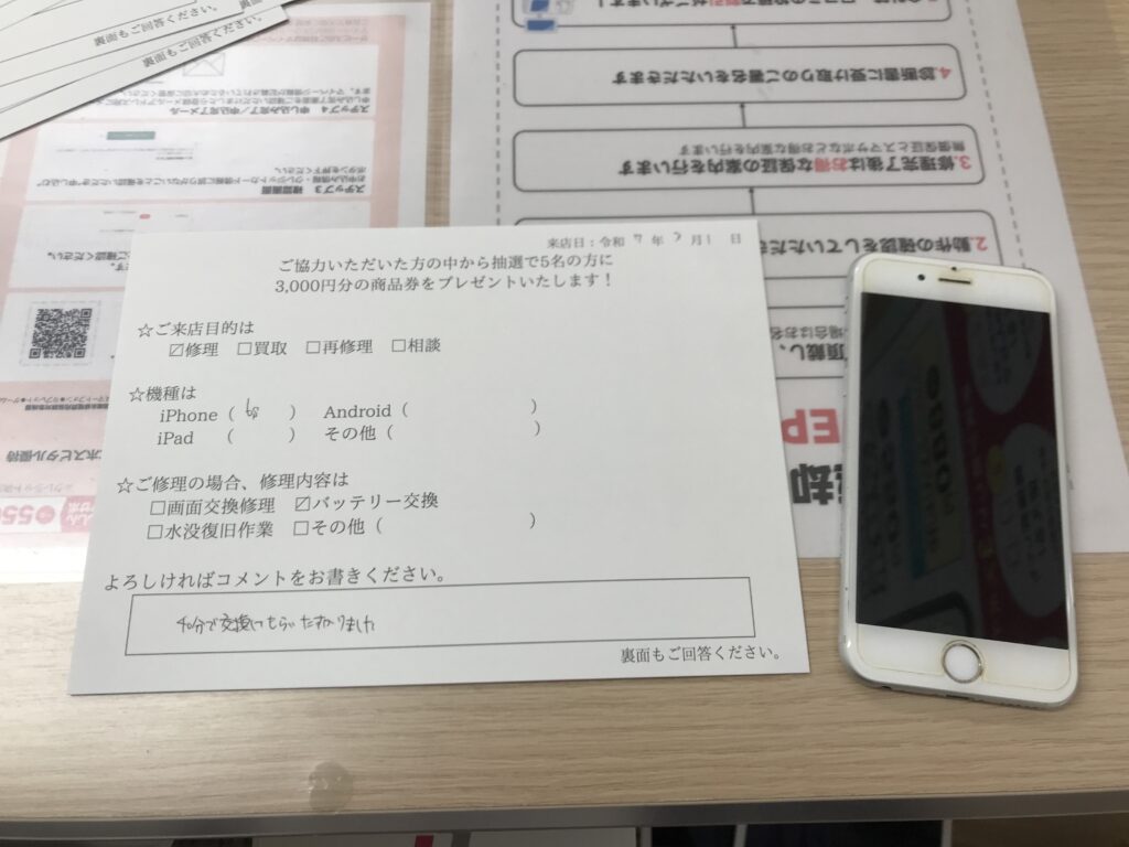 スマホスピタル 大阪梅田 【お客様の声】兵庫県西宮市よりお越しのお客様iPhone6sバッテリー交換修理させて頂きました。