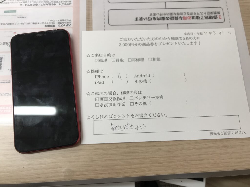スマホスピタル 大阪梅田 【お客様の声】東大阪市よりお越しのお客様iPhone11画面交換修理させて頂きました。