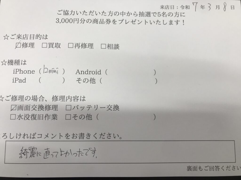 スマホスピタル 大阪梅田 【お客様の声】大阪市よりお越しのお客様iPhone12mini画面交換修理をさせて頂きました。