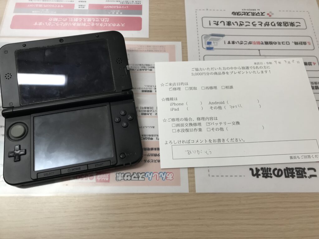 スマホスピタル 大阪梅田 【お客様の声】兵庫県西宮市よりお越しのお客様3DSLLバッテリー交換修理をさせて頂きました。