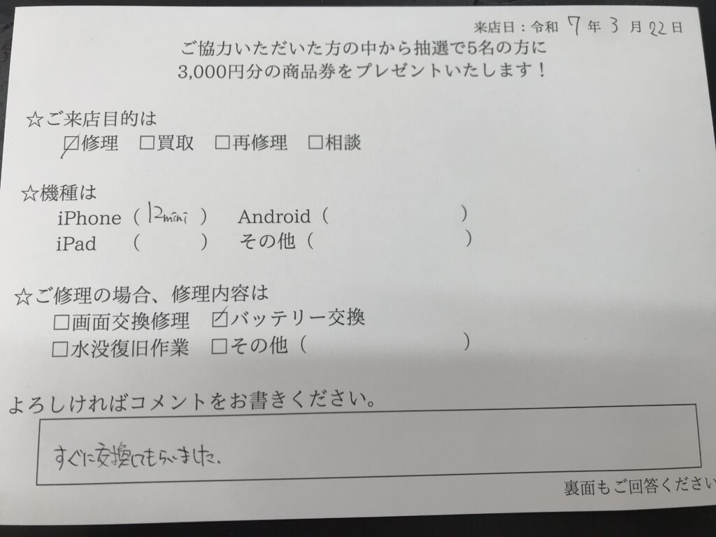 スマホスピタル 大阪梅田 【お客様の声】吹田市よりお越しのお客様iPhone12miniバッテリーをさせて頂きました。