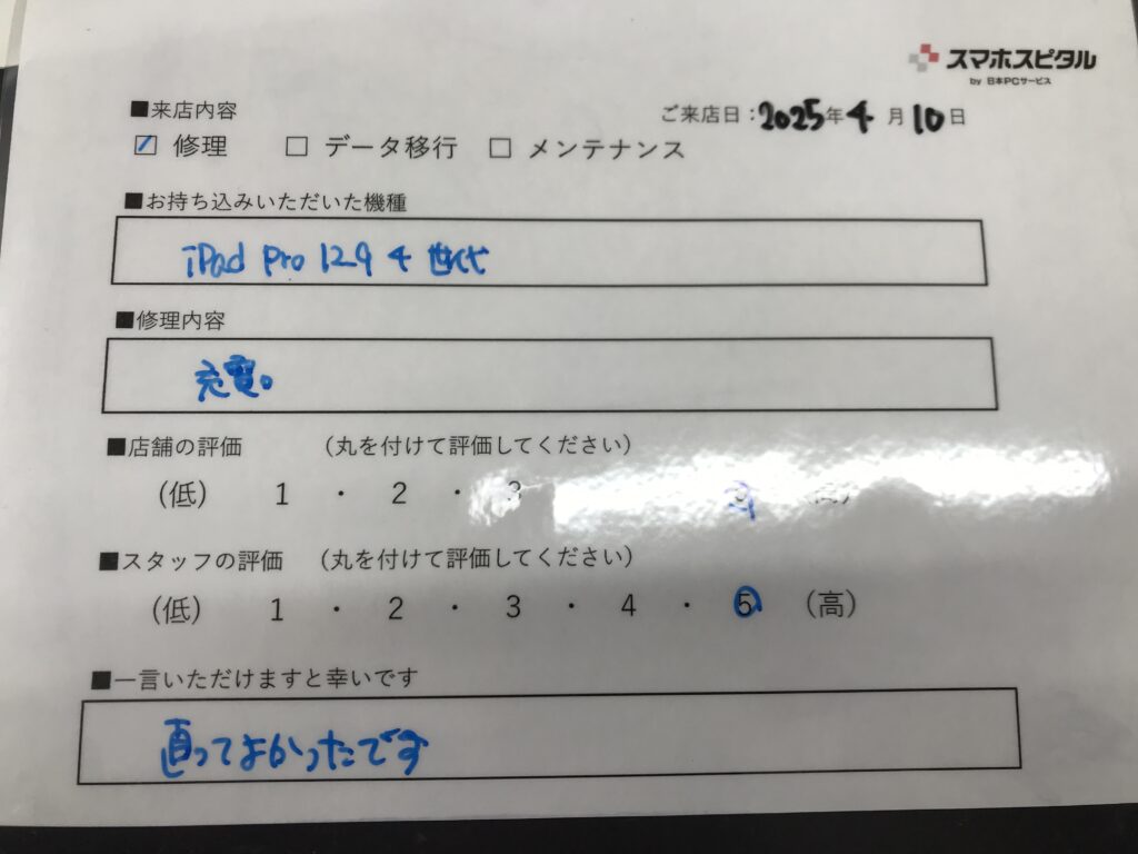 スマホスピタル 大阪梅田 【お客様の声】兵庫県尼崎市よりお越しのお客様iPad12.9第4世代充電口交換修理させて頂きました。
