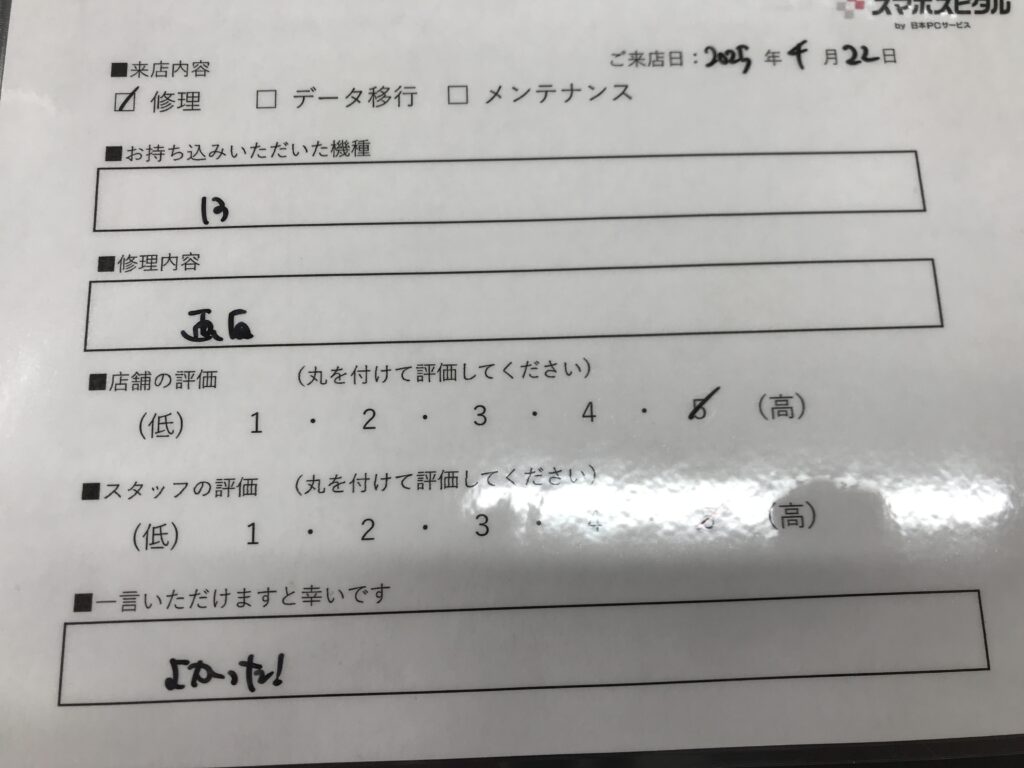 スマホスピタル 大阪梅田 【お客様の声】東大阪市よりお越しのお客様iPhone13画面交換修理をさせて頂きました。