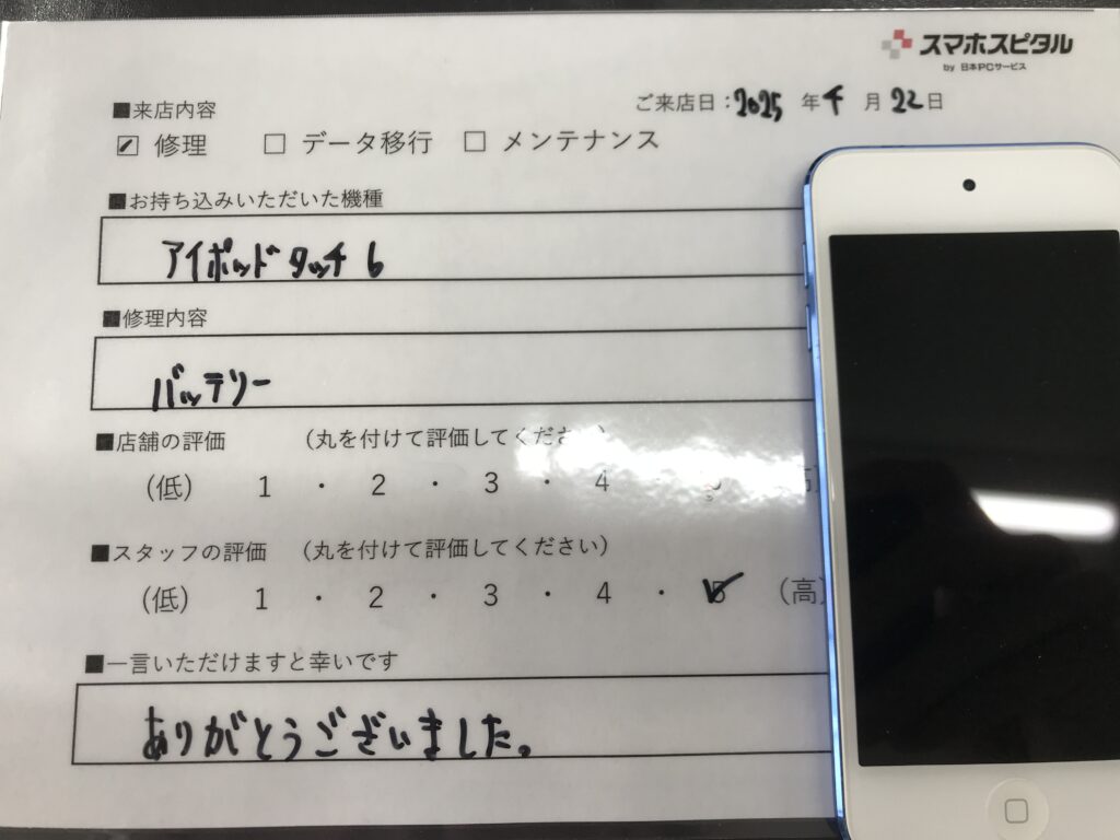 スマホスピタル 大阪梅田 【お客様の声】大阪市よりお越しのお客様iPodtouch6バッテリー交換修理をさせて頂きました。