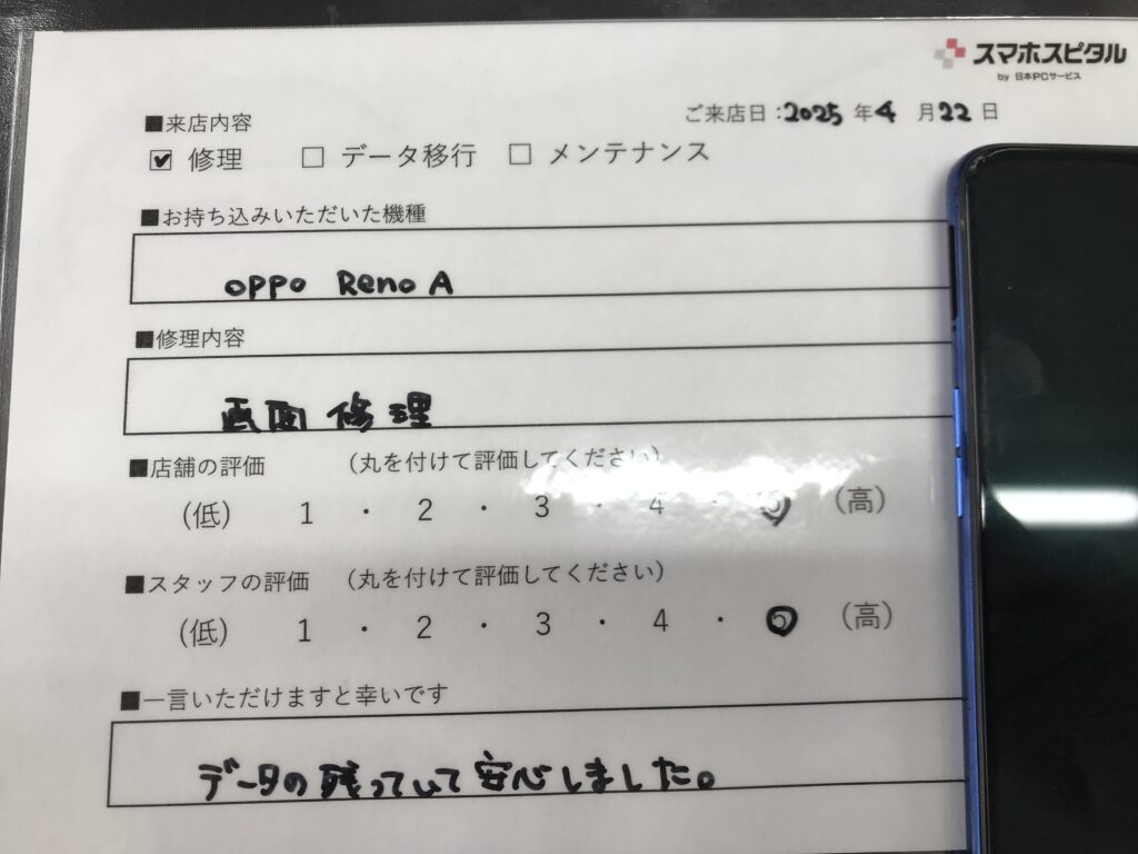 スマホスピタル 大阪梅田 【お客様の声】大阪市よりお越しのお客様OPPO Reno A画面交換修理をさせて頂きました。
