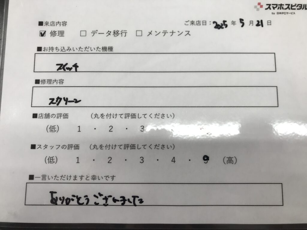 スマホスピタル 大阪梅田 【お客様の声】尼崎市よりお越しのお客様Switch液晶交換修理をさせて頂きました。