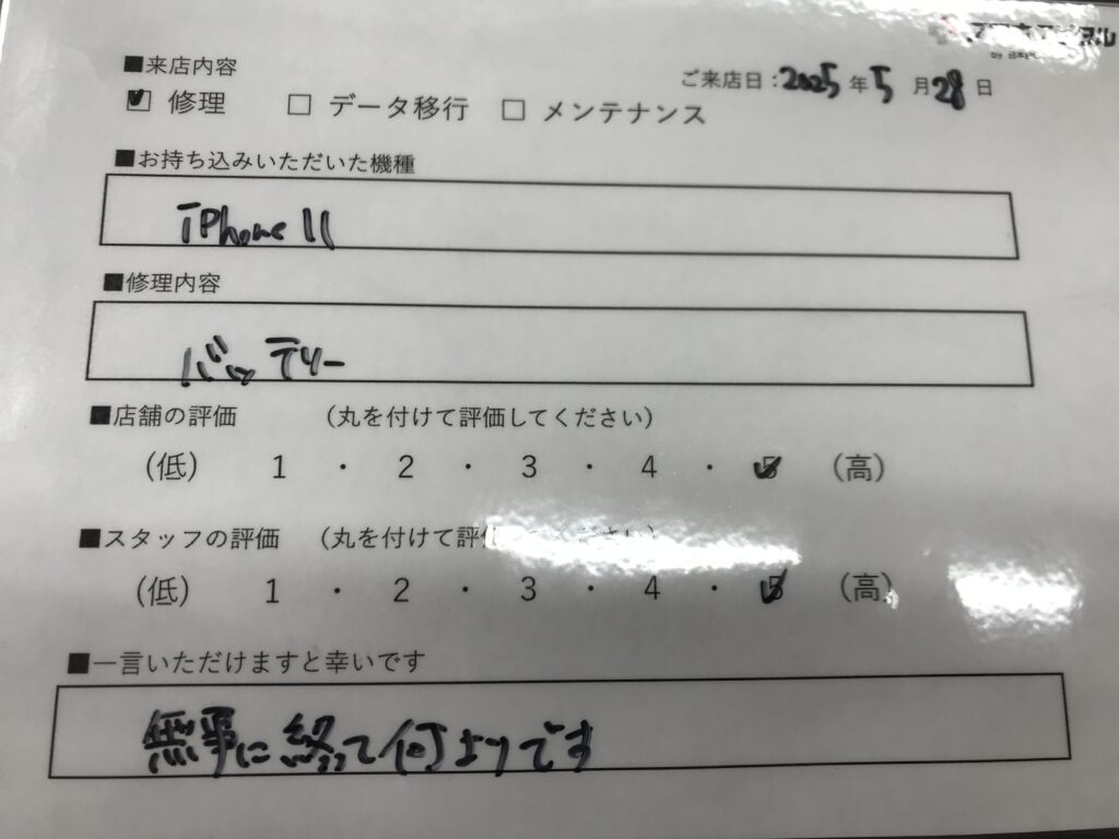 スマホスピタル 大阪梅田 【お客様の声】尼崎市よりお越しのお客様iPhone11バッテリー交換修理をさせて頂きました。