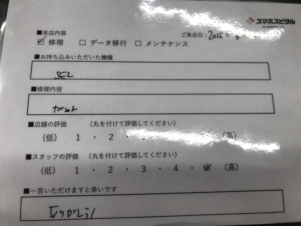 スマホスピタル 大阪梅田 【お客様の声】大阪市よりお越しのお客様iPhoneSE2画面交換修理をさせて頂きました。