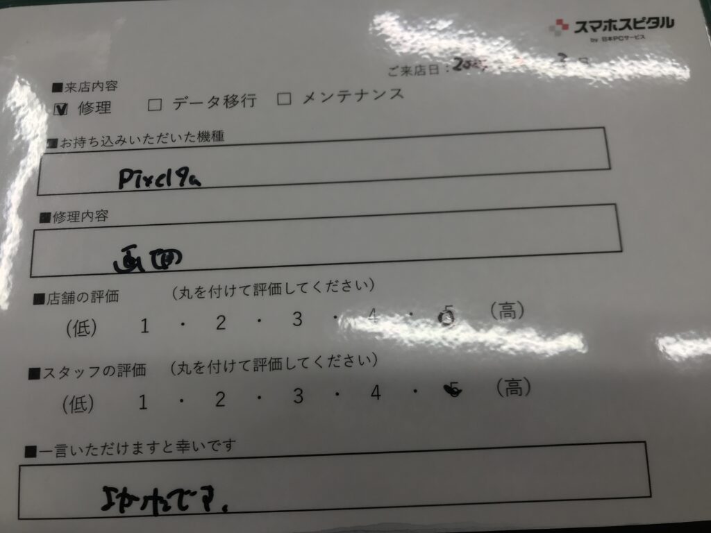 スマホスピタル 大阪梅田 【お客様の声】吹田市よりお越しのお客様Pixel7a画面交換修理をさせて頂きました。