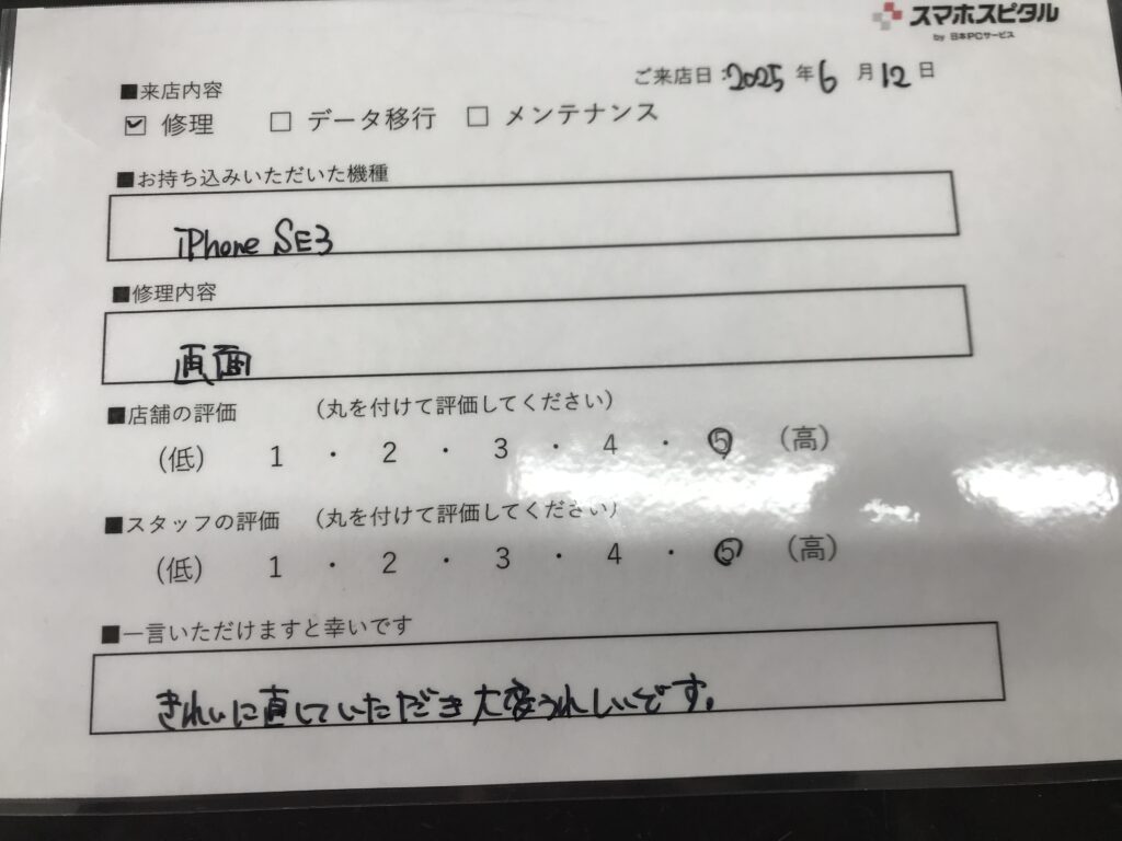 スマホスピタル 大阪梅田 【お客様の声】大阪市よりお越しのお客様iPhoneSE3画面交換修理させて頂きました。