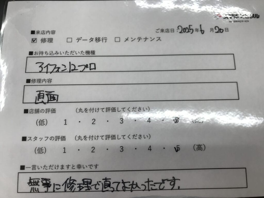 スマホスピタル 大阪梅田 【お客様の声】東大阪市よりお越しのお客様iPhone12Pro画面交換をさせて頂きました。