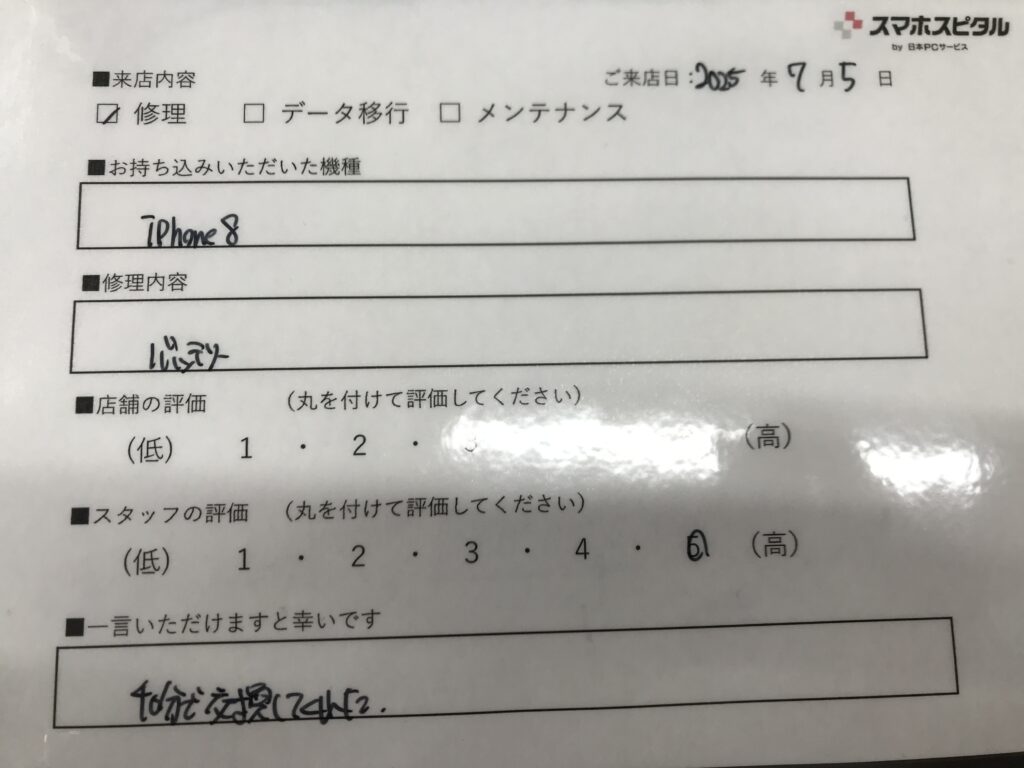 スマホスピタル 大阪梅田 【お客様の声】大阪市よりお越しのお客様iPhone8バッテリー交換修理をさせていただきました。